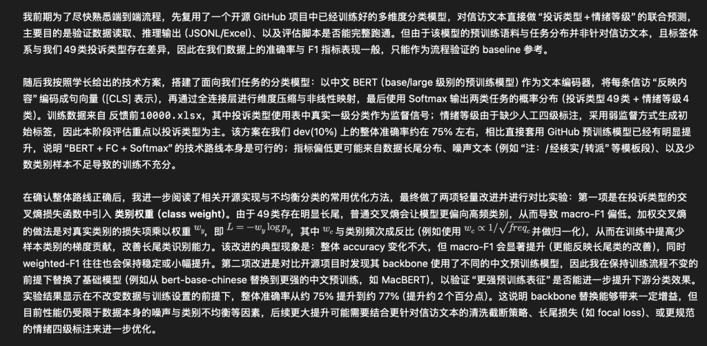 • 标注数据集(不少于500条),并使用标注后的信访数据集,分别训练命名实体识别(BERT+CRF)、基础文本分类模型,实现核心功能的初步落地