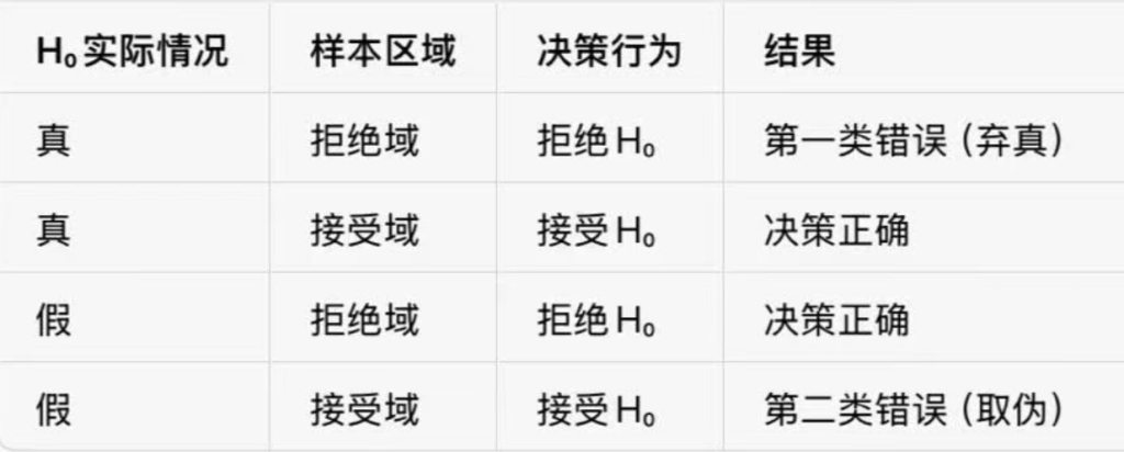 • 第二类错误(存伪错误):\(H_0\)实际错误,接受\(H_0\)。