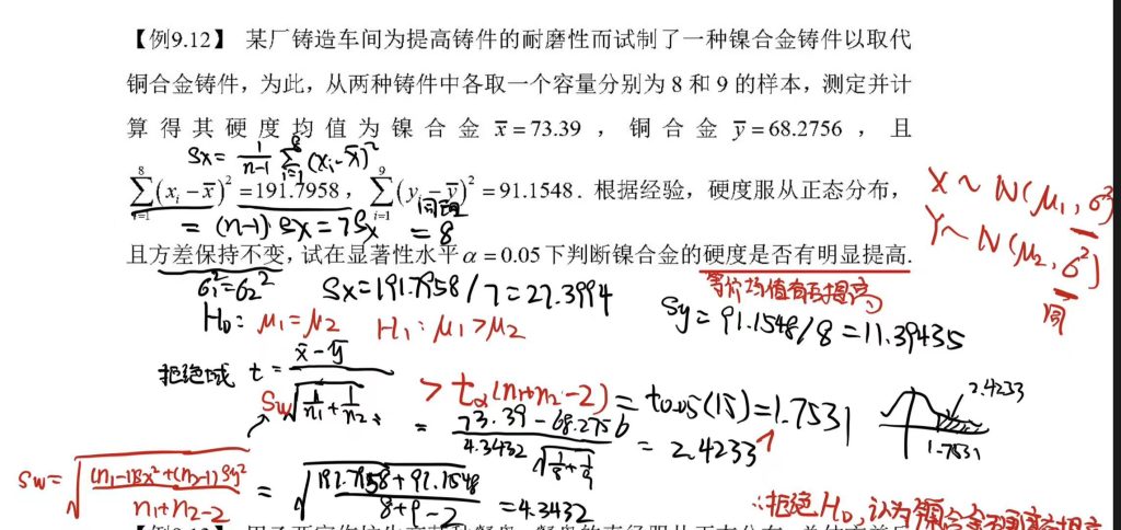 这里我们的\(t=0.05 < 1.66\),所以不拒绝原假设\(H_0\)—— 也就是说,目前的样本证据不足以证明这批灯泡平均寿命 > 4000h,需要谨慎决策。