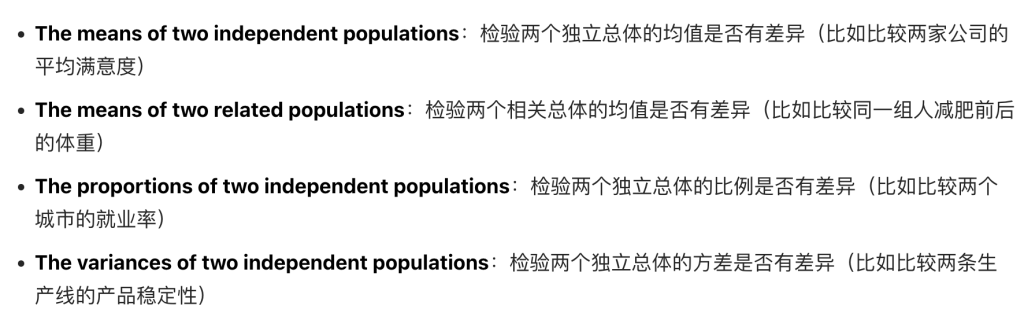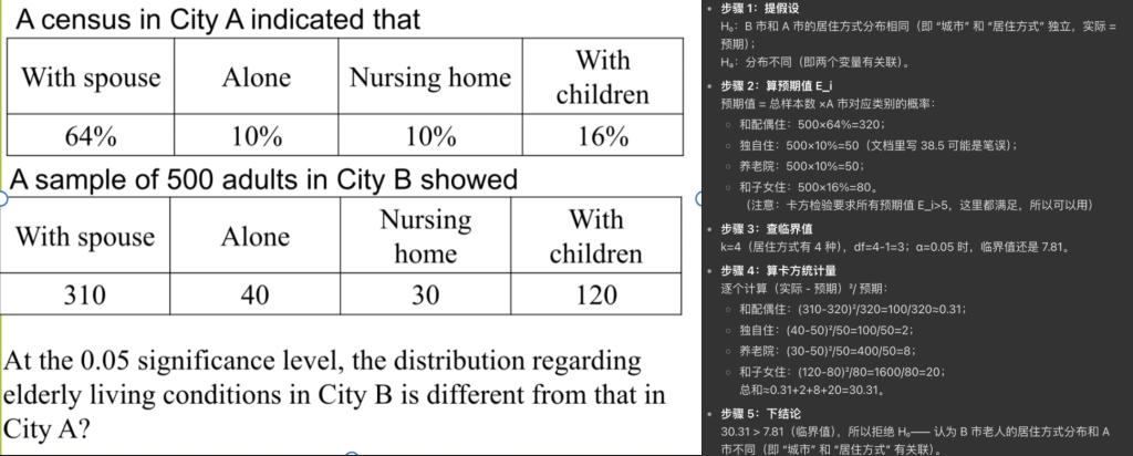 • 假设检验问题: 假设检验是检验某个关于总体参数(比如均值、比例等)是否成立的方法。先提出关于总体的 “假设”,再用样本证据判断 “是否有足够理由推翻原假设”,回答 “决策是否合理”