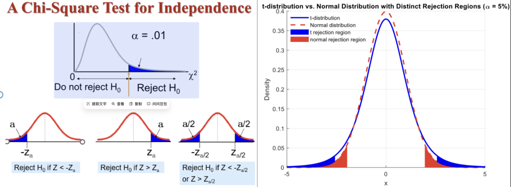 卡方检验的拒绝域永远是在单侧且在右尾,如果我们与Z检验(正态分布)对比的话,同时还有与Z检验很相近的t检验: