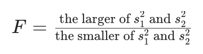 计算时将两个样本方差 \(s_1^2\) 和 \(s_2^2\) 中较大的那个作为分子较小的作为分母,公式为: