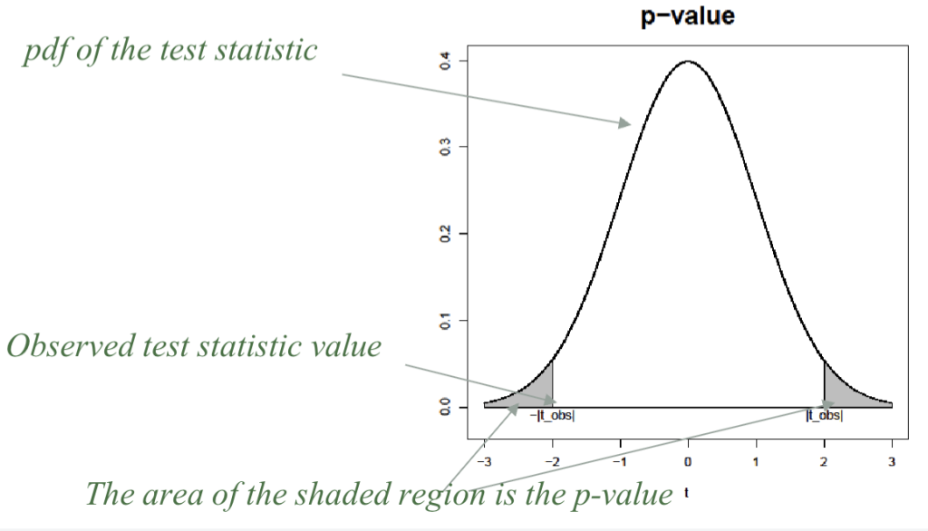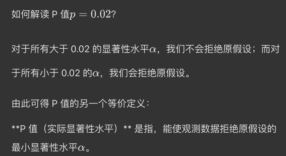 定义:检验的 P 值是指,在原假设H0​成立的条件下,检验统计量取到与观测值相等或更极端值的概率。