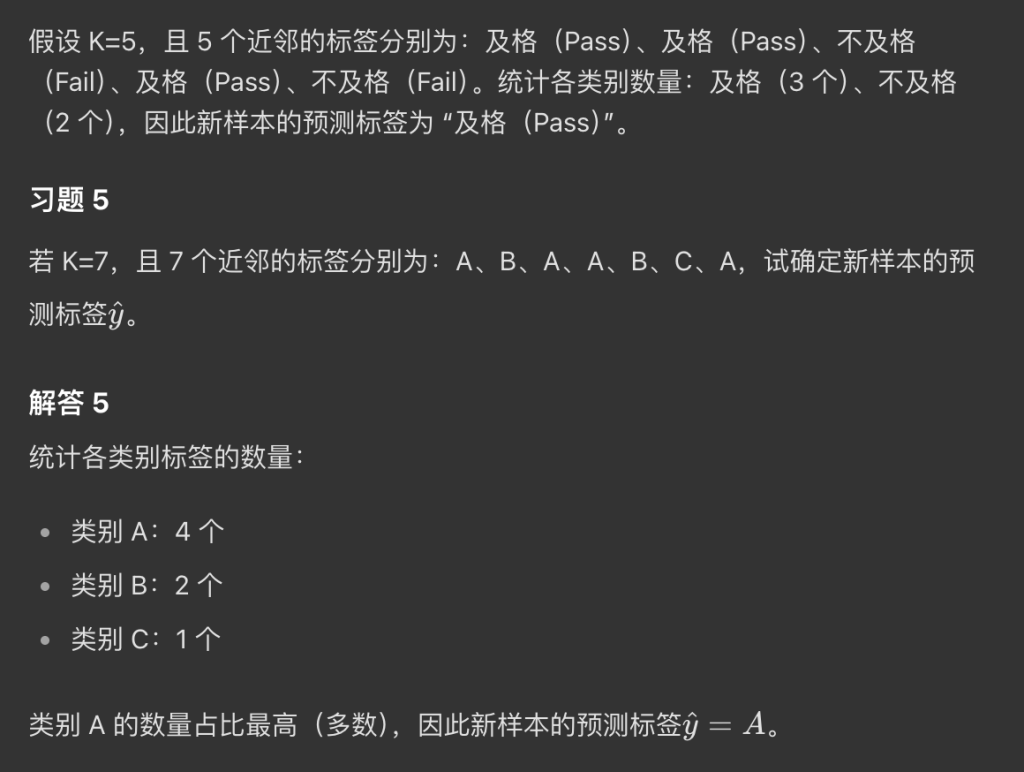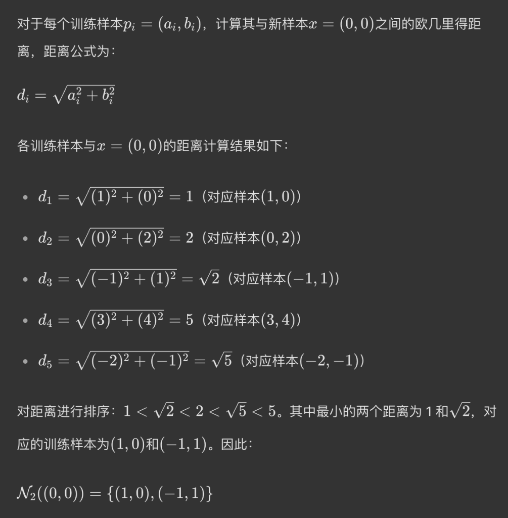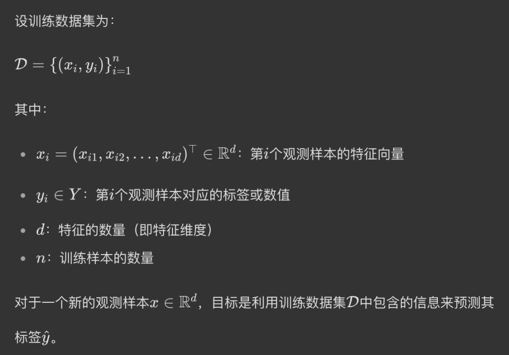 KNN 算法被称为 “惰性学习器”,是因为它没有显式的参数估计阶段:算法会存储全部训练集数据,将计算过程推迟到预测阶段。对于一个新的输入样本x,KNN 算法会计算该样本与所有训练样本xi之间的距离d(x,xi),然后对距离最近的 K 个样本的标签(或数值)进行聚合,从而得到预测结果。