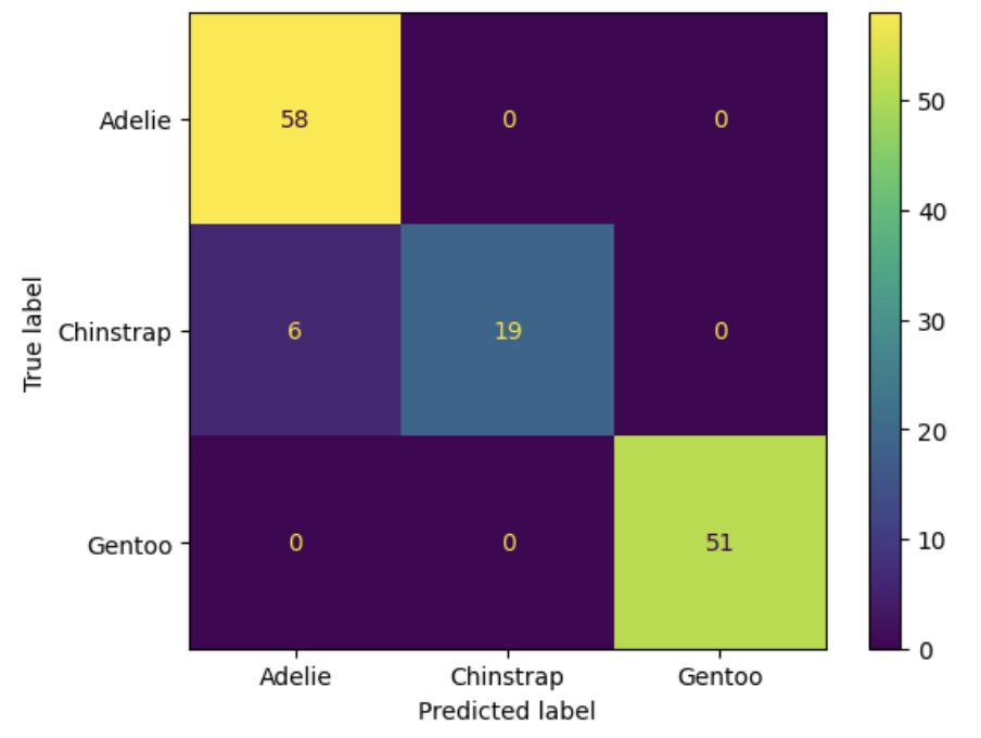混淆矩阵是正方形矩阵,行数和列数等于标签的唯一值数量(此处为 3,对应三种企鹅)。