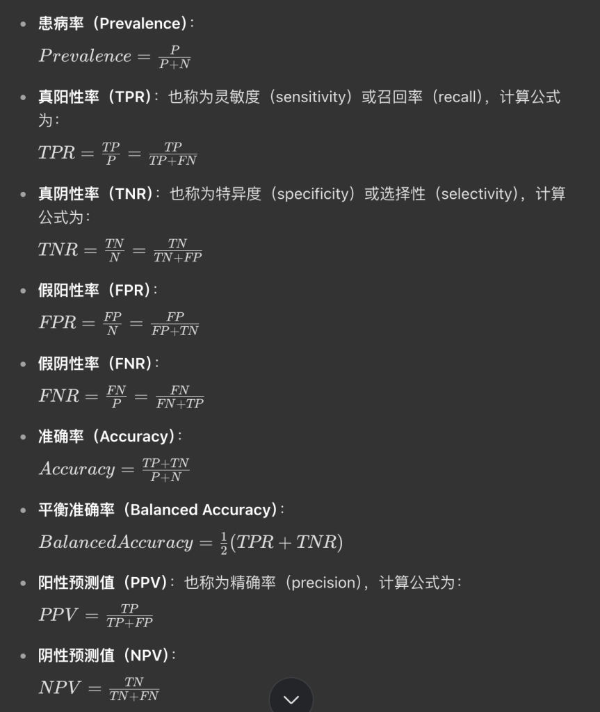 有了 TP、FP、FN、TN 这些基础数据后,我们可以计算多种模型性能评价指标。以下是最常用的指标,其中P代表测试集中正类的总数量,N代表测试集中负类的总数量。