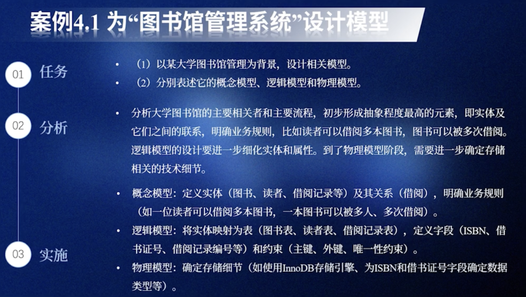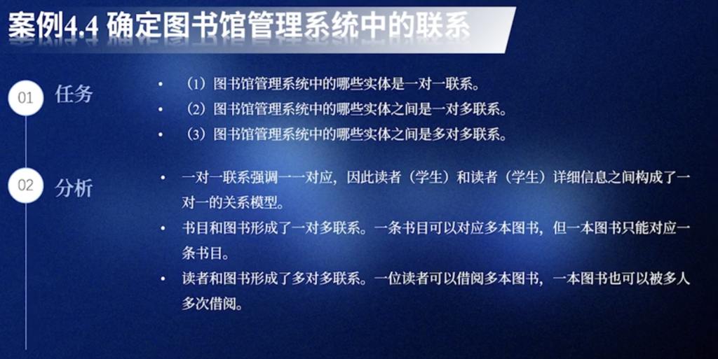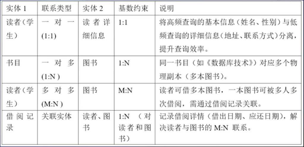 在关系数据库中不能直接实现多对多联系,那么就有了第四行内容读者和图书与借阅记录都是一对多的联系,借阅记录作为一个中间表呈现