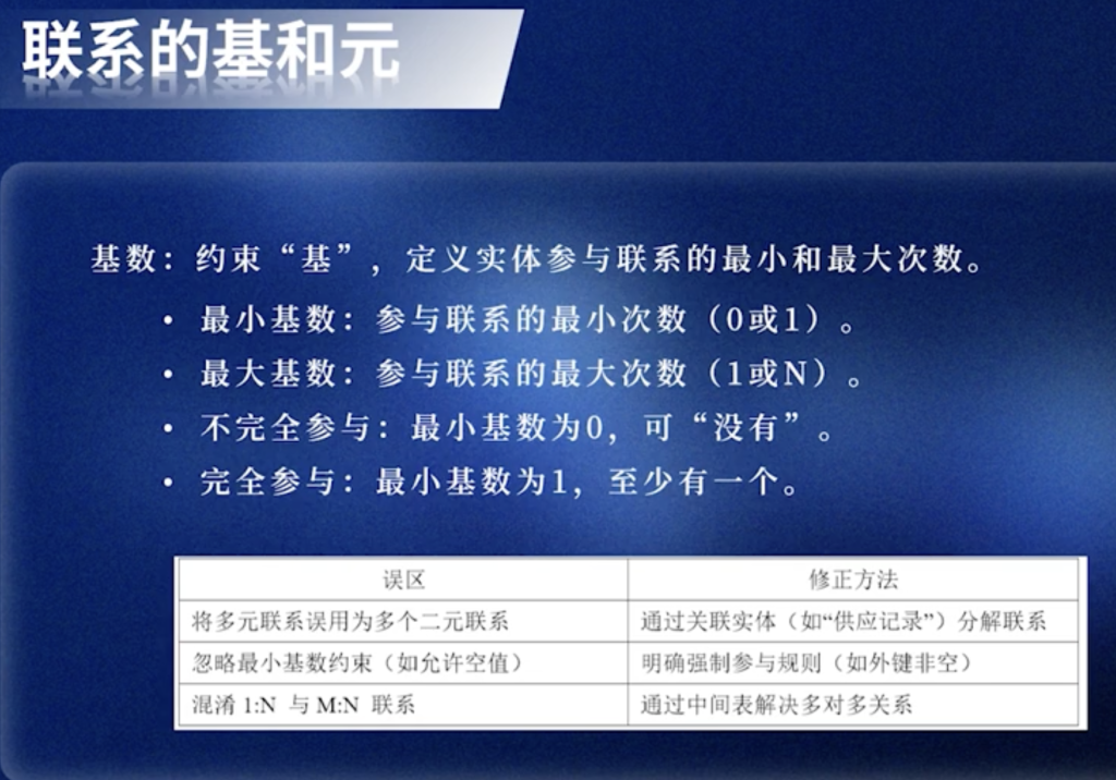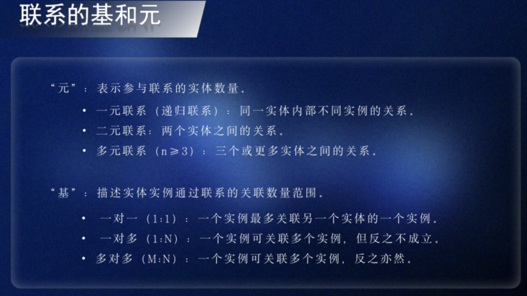 | 关系基数标注 | 数字 / 符号(1、N、M 等) | 实体间关联的数量限制 | 标注在关系与实体的连接线上,如 1:1(学生 – 身份证)、1:N(班级 – 学生)、M:N(学生 – 课程) |