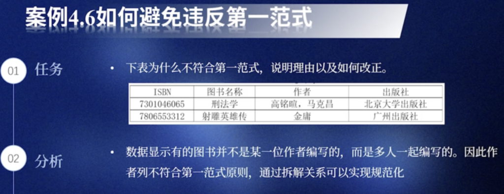 解决方法:将作者信息拆解为单独的关系表,转化后变成两张表,形成数目和作者一对多的关系,这样每条书目的作者都可以在作者表中体现同时不违反第一范式