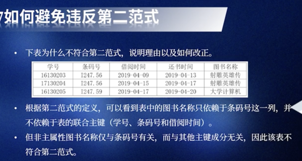图书名称(非主键)仅仅依赖于条码号,而不是整个联合主键,而这个表的联合主键有多个列