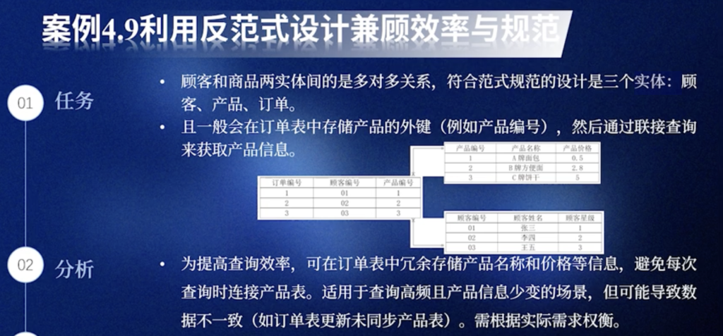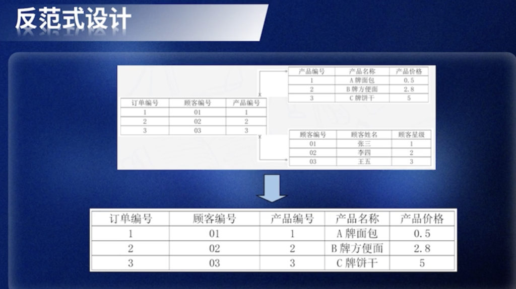 订单需要快速查找,且信息一般都不变。可以改用反范式设计,牺牲一部分规范性约束换取效率的提升