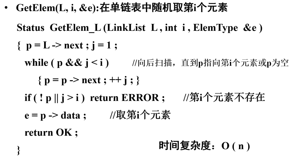 • 操作结果:用 e 返回线性表 L 中第 i 个数据元素的值