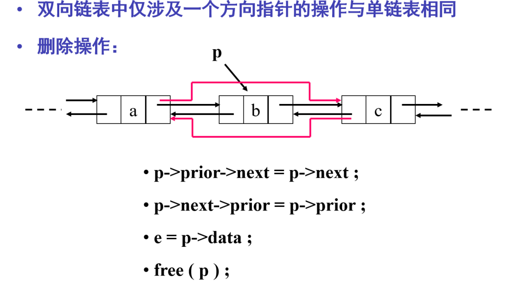 p->next->pre = p->pre;   // 该节点后继的 pre 指向该节点的前驱,完成删除