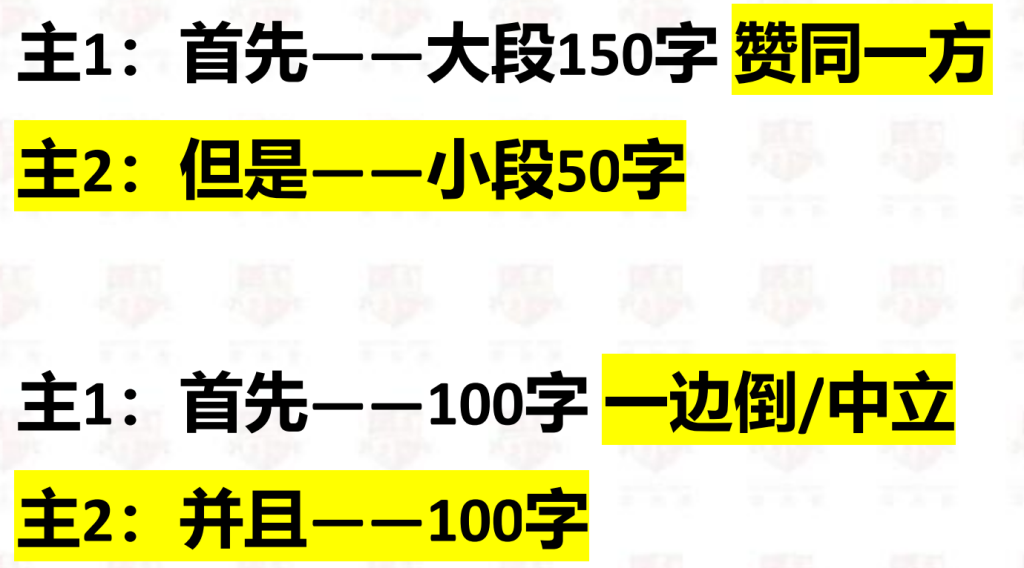 主1:100字,主2:100字 如何赞同(反驳)一个观点? 原因+结果+举例子 原因+结果+举例子