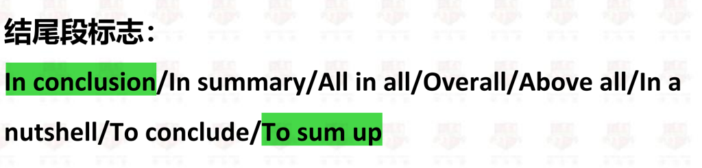 总结句:改写中心句,总结句:改写中心句 Generally=In general=Generally speaking=All in all=Overall 可以引出下一段的内容 大小段中间可以写连接句
