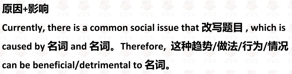 解释句(20字) – 抽象 Initially, it is evident that 原因+影响(我觉得可以换一个顺序)+第一个例子(70字) Besides, when……原因+影响+第二个例子(70字) (Generally, sb should do sth……, while this trend also implies potential threat to …..)