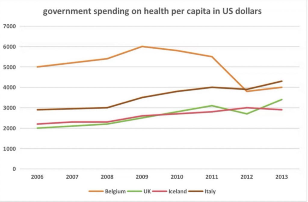 The line chart demonstrates the governmental(改形容词) investment (替换同义词) in/budget for public healthcare in four countries between 2006 and 2013.