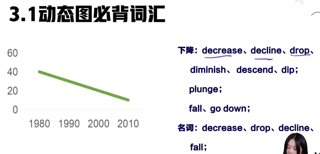 动词:decrease=decline=drop=fall=go down=descend