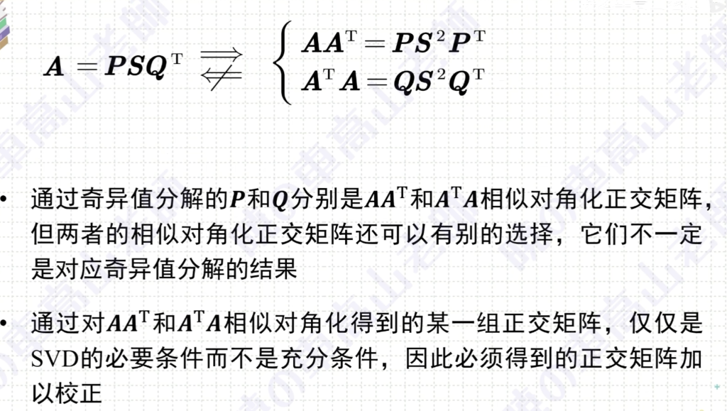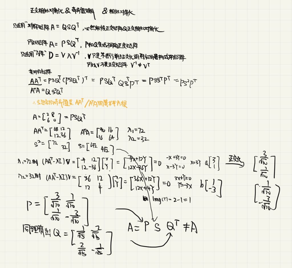 | 1. 变换矩阵要求 | 仅需可逆(\(P^{-1}\) 存在) | 必须为正交矩阵 (\(Q^T = Q^{-1}\))要求更严格 |