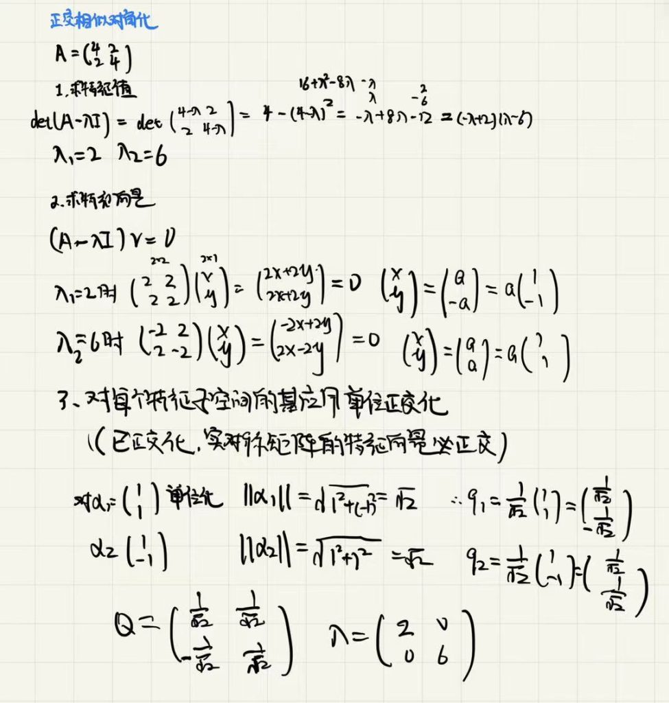 - 第三步:将所有特征子空间的标准正交基向量作为列,构成矩阵P,则P是正交矩阵,且可使A对角化(即PTAP为对角矩阵)。