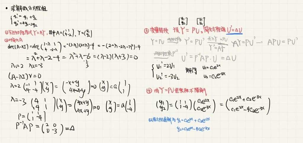 但如果A不是对角矩阵,我们需要变量替换,构造一个新的变量U,让新的方程组U′=ΔU(Δ是对角矩阵),这样就能用对角矩阵的简单解法来处理了,最后再通过我们所设的Y = PU变换将U变为Y就能得到原解了