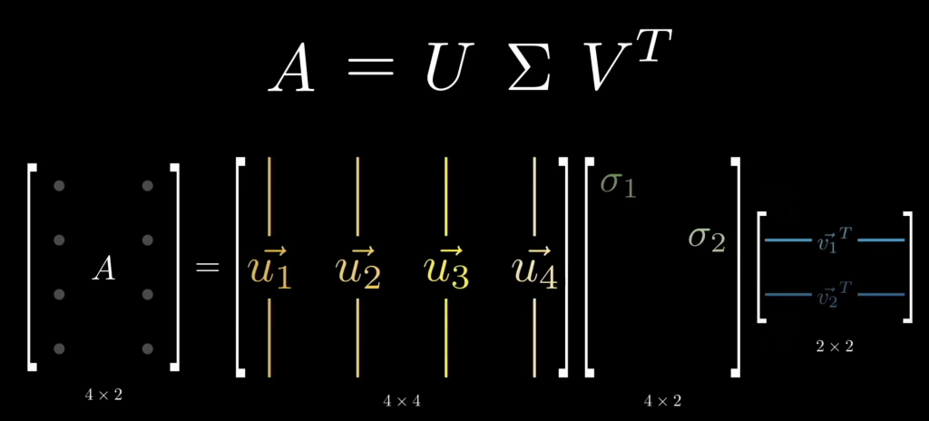 只有对角线有值,按降序排序。其他为 0,这些值叫 “奇异值”,奇异值越大,对应部分越重要;- 当矩阵不是方阵时中间的sigma为广义的对角矩阵,形状与原矩阵相同