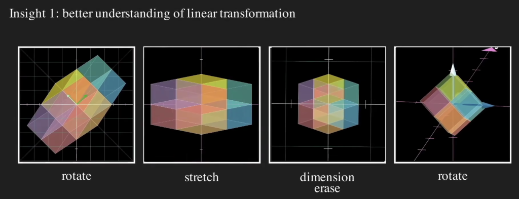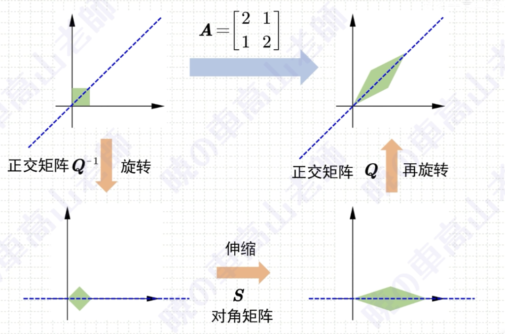 几何理解:P正交矩阵:旋转坐标系,A对角矩阵:伸缩坐标系,P^T正交矩阵的转置即逆矩阵:还原旋转为原来的坐标系