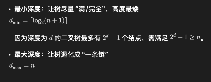 例题:若一颗二叉树共有n个结点,则二叉树的深度最小为多少,最大为多少