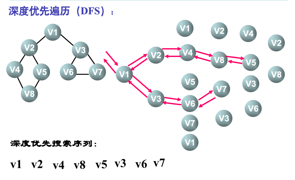 则从 \(v_2\) 出发进行搜索。依次类推,接着从 \(v_4, v_8 、v_5\) 出发进行搜索。在访问了 \(v_5\) 之后,由