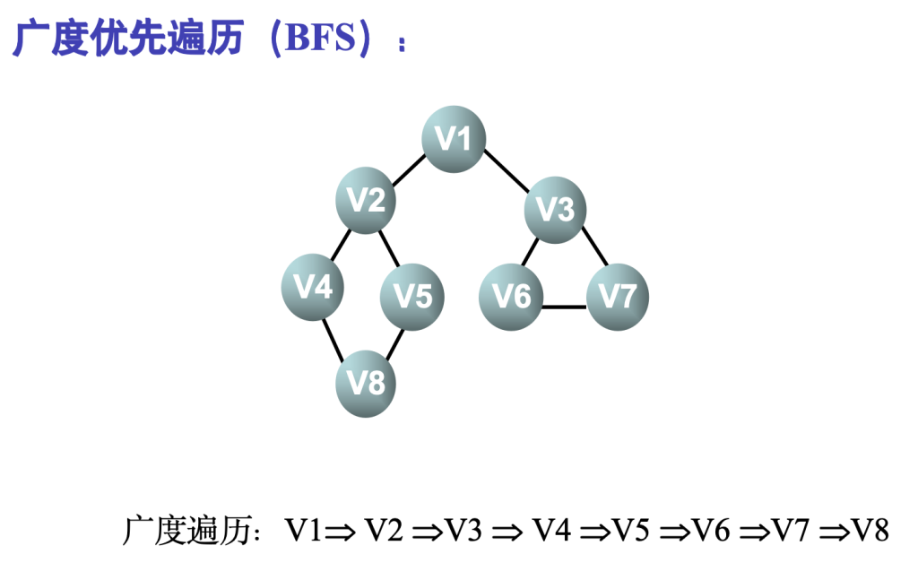 - 然后分别从这些邻接点出发,依次访问它们的邻接点,并使“先被访问的顶点的邻接点”先于“后被访问的顶点的邻接点”被访问,直至图中所有已被访问的顶点的邻接点都被访问到