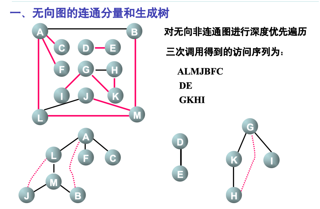 - 若此时图中尚有顶点未被访问,则另选图中一个未被访问的顶点做起点,重复上述过程,直到所有顶点都被访问过