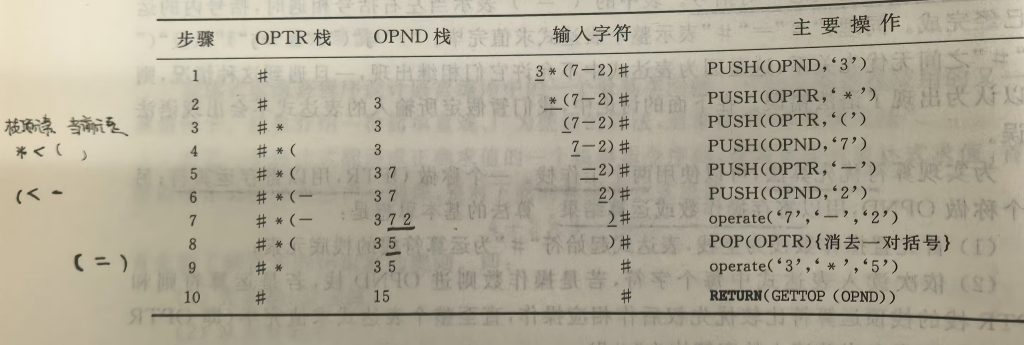 依次读入表达式中每个字符,若是操作数则进OPND栈,若是运算符则和OPTR栈的栈顶运算符比较优先权后作相应操作,直到整个表达式求值完毕(即OPTR栈的栈顶元素和当前读入的字符均为“#”)