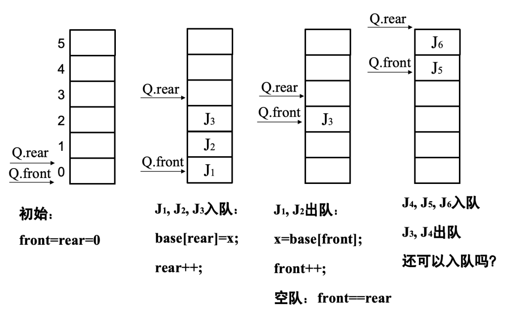 (q.rear + 1) % MaxQSize:表示下一个队尾的位置。因为rear是当前队尾位置,插入一个新元素后,队尾要后移一位,通过取模运算保证在数组范围内循环。