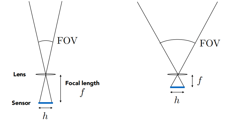 对于固定的传感器尺寸,减小焦距会增加视野 For a fixed sensor size, decreasing the focal length increases the field of view $$FOV = 2\arctan\left(\frac{h}{2f}\right)$$