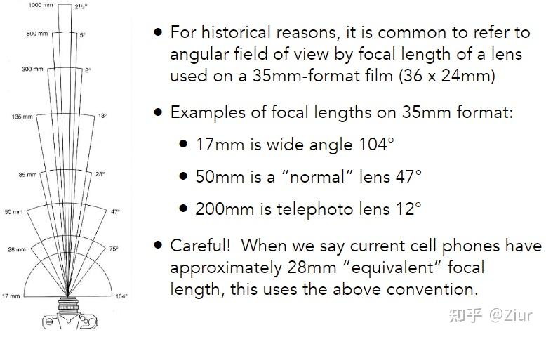 视场与传感器大小和焦距都有关系,所以人们通常规定以 35mm 格式胶片 (36 x 24mm) 上使用的镜头焦距来表示视场角 For historical reasons, it is common to refer to angular field of view by focal length of a lens used on a 35mm-format film (36 x 24mm)