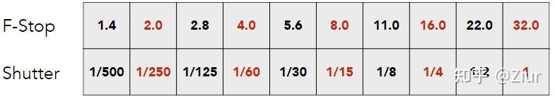 以下表格对应的光圈和快门速度可以得到几乎等效的曝光(比如光圈f4.0到f8.0光圈直径减小到1/2,面积变为原来的1/4,所以快门速度相应的要补偿4倍) Example: these pairs of aperture and shutter speed give equivalent exposure