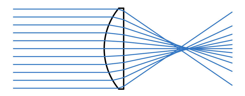 现实中的的一些透镜并不是我们假设的理想透镜,它无法将光线会聚到一点 Real plano-convex lens (spherical surface shape). Lens does not converge rays to a point anywhere