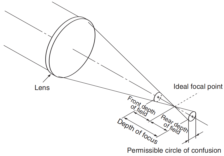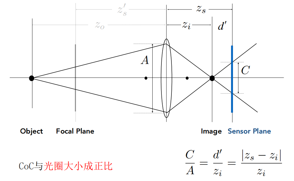 弥散圆CoC(Circle of confusion) 指的是物点成像时,由于像差,其成像光束不能会聚于一点,在像平面上形成一个扩散的圆形投影,与光圈大小成正比