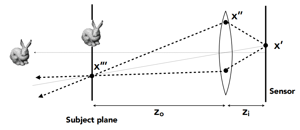 • 后期改变焦距用到的也是类似的思想,需算出前后移动传感器,然后应该查询哪条光线,也可能对不同透镜查询不同位置的光线