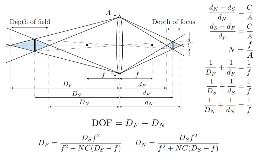考虑景深的最远处和最近处,推一下公式,就可以把景深与其他参数联系起来