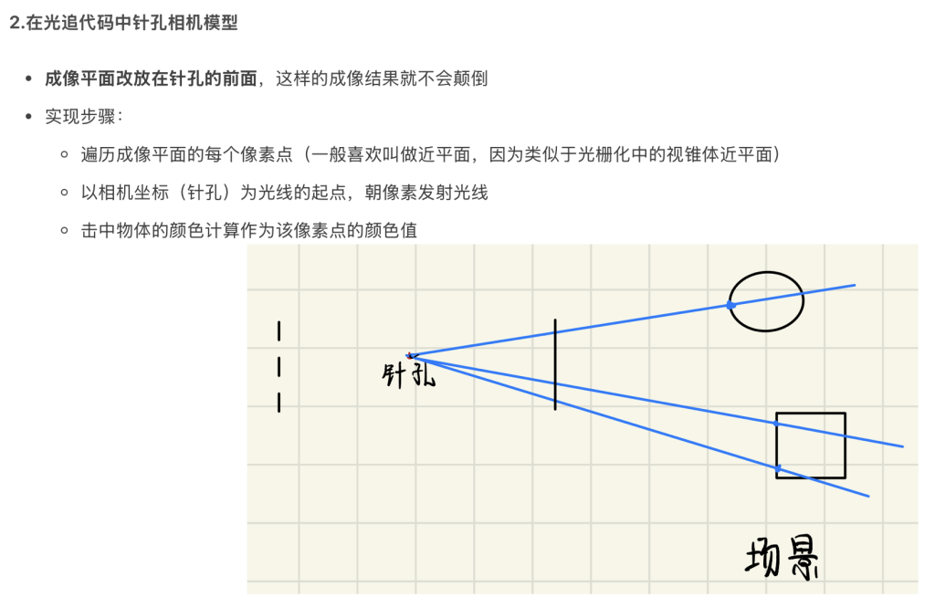 • 针孔相机成像是没有景深的,我们做光线追踪的时候用的也是针孔相机,所以也是无法产生景深模糊的,如果我们能模拟光线与透镜的作用,那么我们也可以得到有景深的画面(只是我们将成像平面移动到了孔的前面)