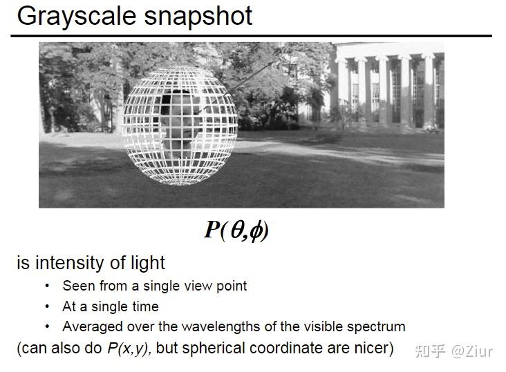 • 从最简单的全光函数开始,我们假设在一个场景中,位置固定,可以四面八方地去看,则用极坐标可以定义我们的方向,全光函数描述了向某个方向看会看到什么样的值