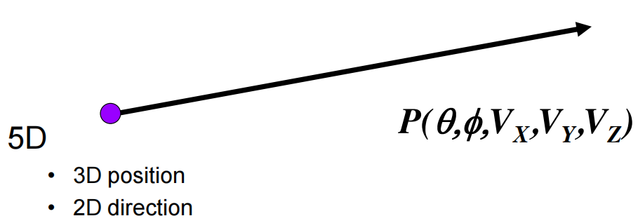 • 一般空间中的光线5D的:3D位置(x, y, z)+2D方向(θ, φ)定义