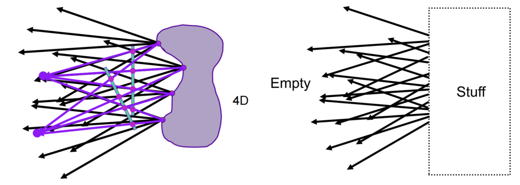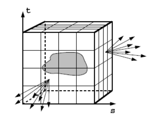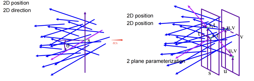 可以通过定义一个平面上点和角度,也可以定义两个平面(分别是uv面和st面)上的点,通过两个坐标信息来表示,这是一个经典的参数化表示的方法