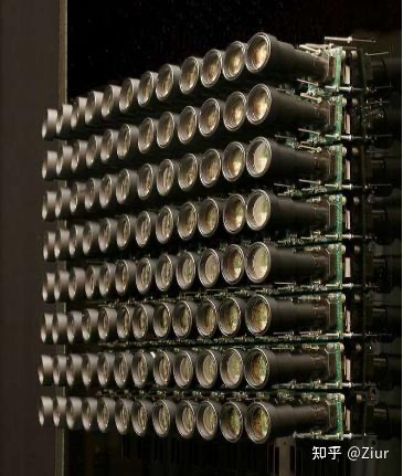 现实中也可以用相机阵列(camera array)来采集光场。做法是在一个平面上摆放很多台相机或很多个镜头,让它们同时从不同位置观察同一个场景。这样,每一台相机都拍到一张略有视差的图像;把所有相机拍到的图像合在一起,就相当于记录了光场中的一部分信息。这里可以把相机阵列中每个镜头的位置理解为光场参数里的 (s,t),表示“从哪里看”;而每台相机图像中的像素坐标可以理解为 (u,v),表示“在这个视点下看到的哪条光线”