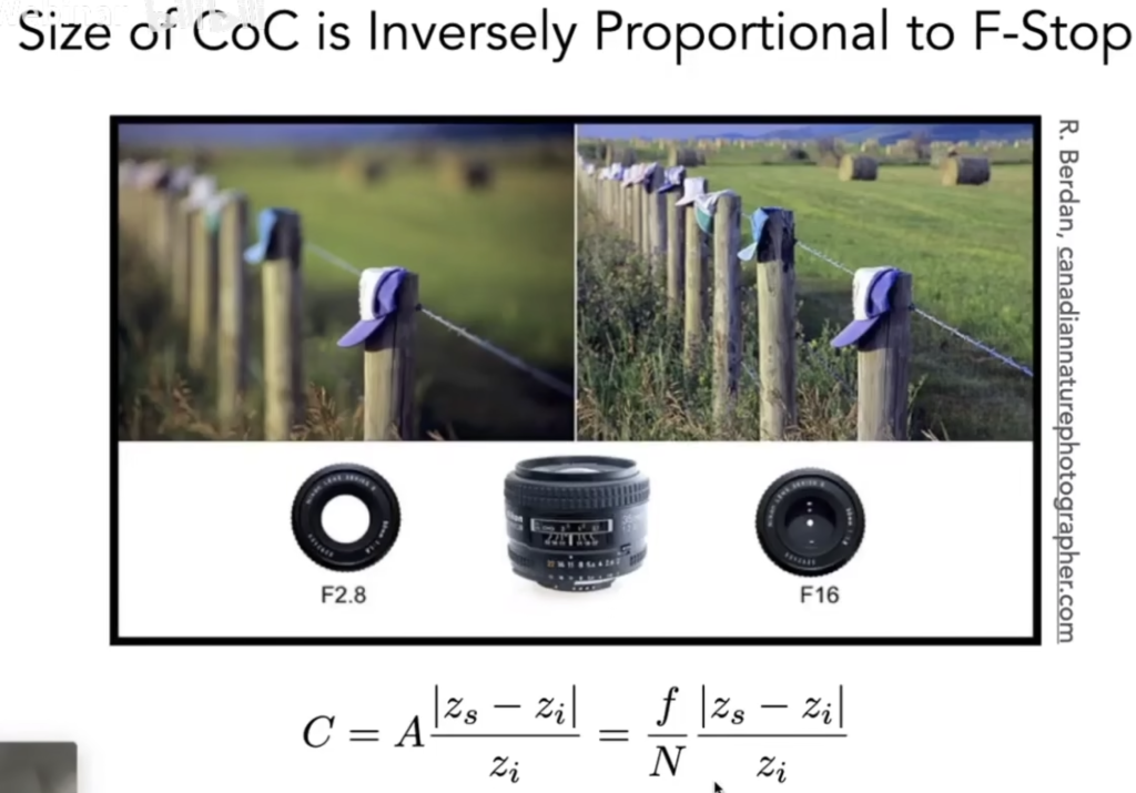 所以我们可以得到弥散圆与光圈大小间成反比 Size of CoC is Inversely Proportional to F-Stop