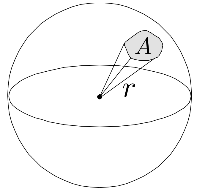 what? 球体上一定区域面积与半径平方的比 ratio of subtended area on sphere to radius squared 立体角 \(\Omega = \frac{A}{r^2}\)