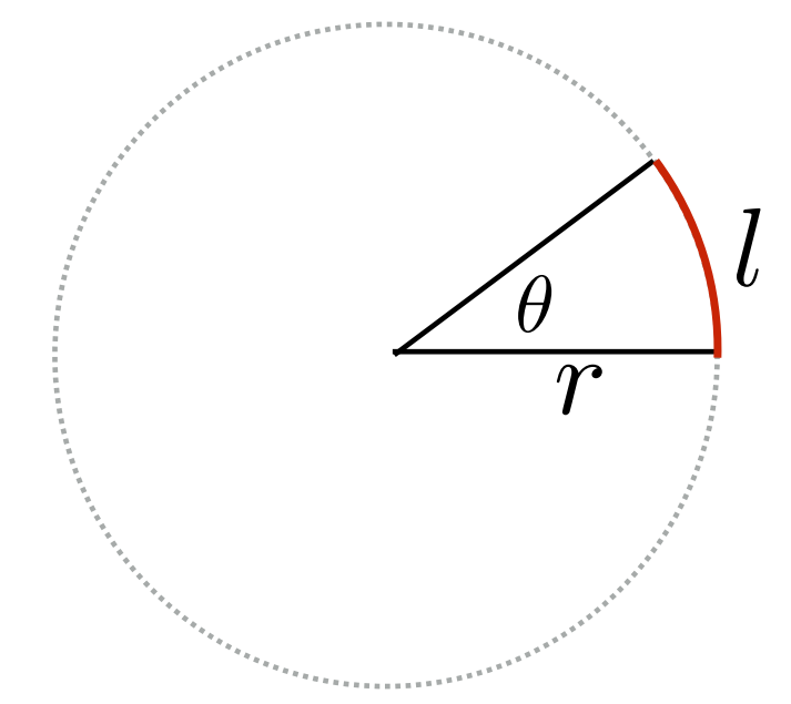 - 角度θ:圆弧的弧长与半径之比\[ \theta = \frac{l}{r} \]