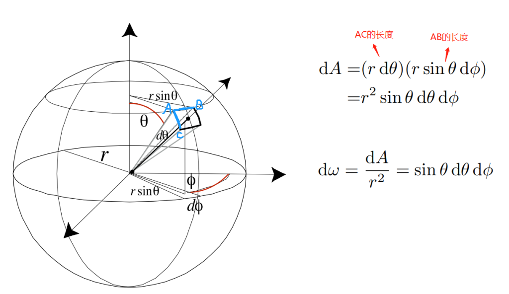 球面上单位面积与半径平方之比,\(d\omega = \frac{dA}{r^2}\) 球面的单位面积 \(dA\) 比较好求,求出弧长 \(AB\) 和 \(AC\) 即可得到。根据圆的弧长公式 \(l = r\theta\),球面的单位面积 \(dA\) 可由对应的弧长相乘得出。