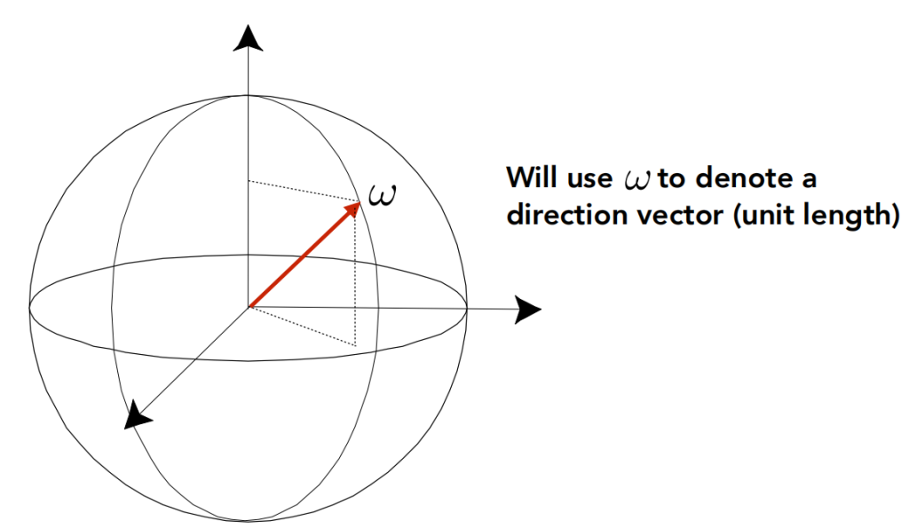 通常把 \(\omega\) 当做方向向量来理解,这样比较好理解 intensity,光源向任意方向辐射的强度